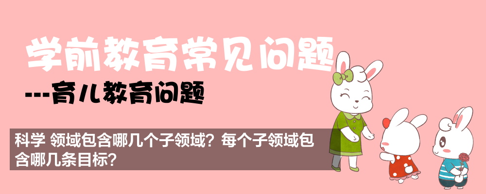 科学领域包含二个子领域(以及子领域下的目标):( 1 )科学探究:目标 1 亲近自然,喜欢探究;目标 2 具有初步的探究能力;目标 3 在探究中认识周围事物和现象。( 2 )数学认知:目标 1 初步感知生活中数学的有用和有趣;目标 2 感知和理解数、量及数量的关系;目标 3 感知形状与空间关系。